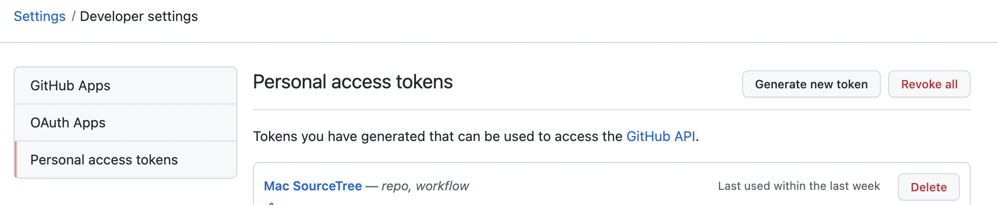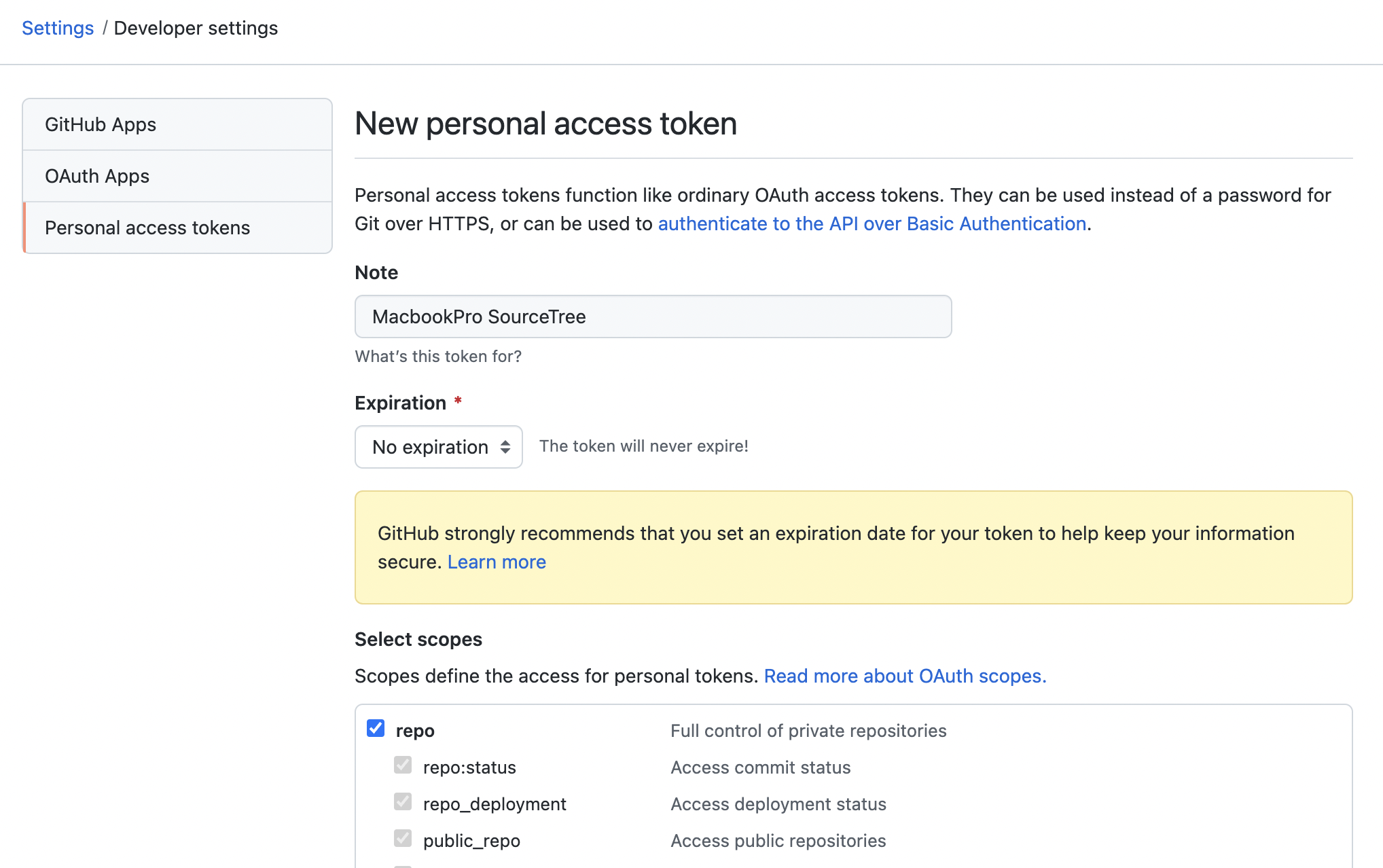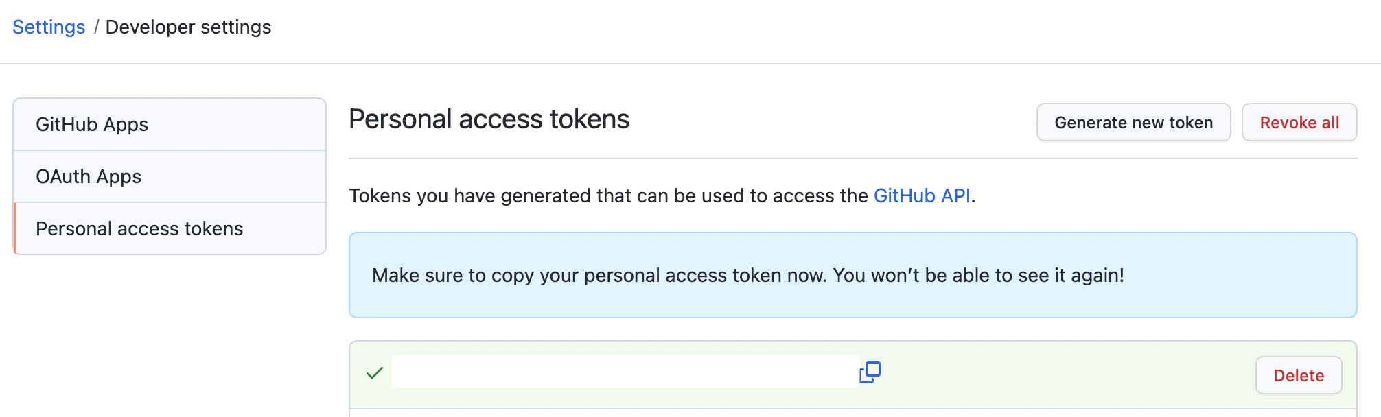 まず以下サイトを参考にアクセストークンを取得します。 https://docs.github.com/ja/authentication/keeping-your-account-and-data-secure/creating-a-personal-access-token