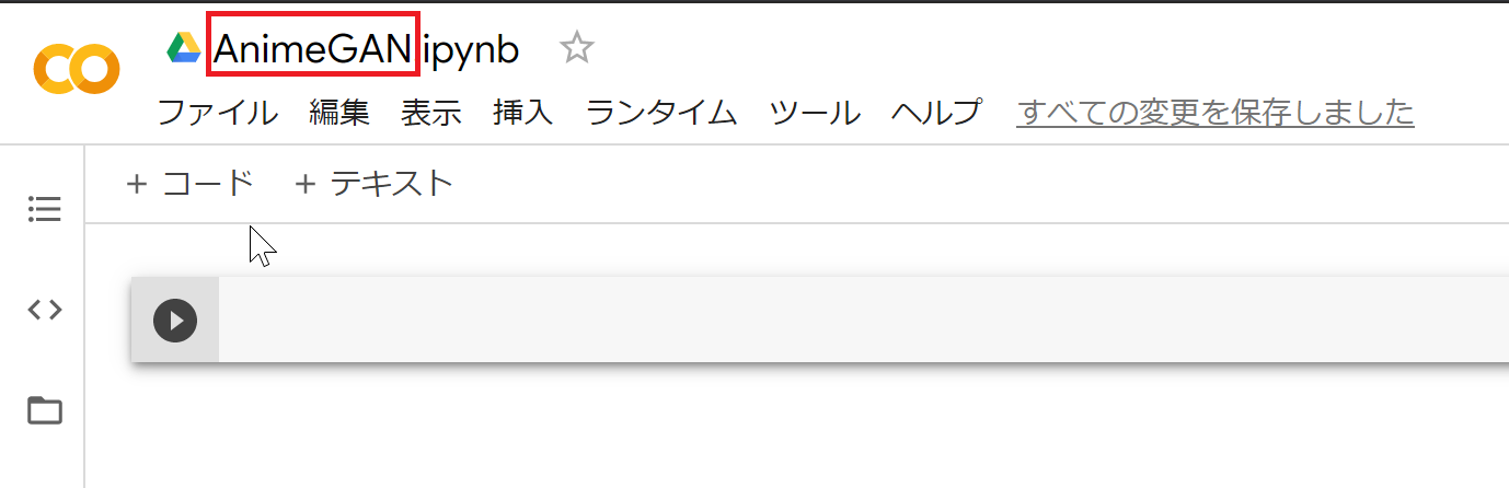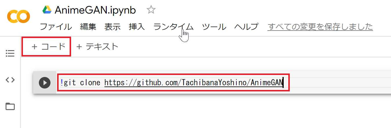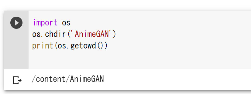 次に「+コード」をクリックして以下を入力します。作業ディレクトリをAnimeGANに変更します。