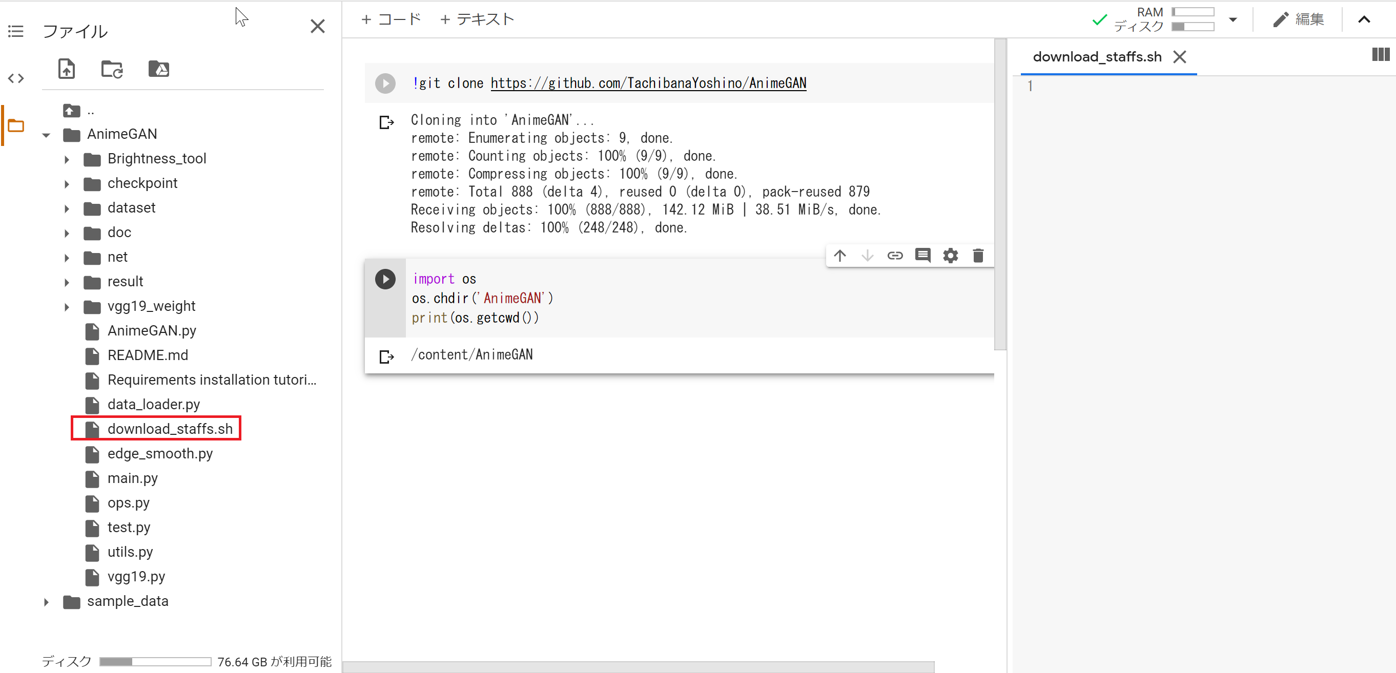 AnimeGANフォルダ配下に「download_staffs.sh」というファイルを新規作成します。