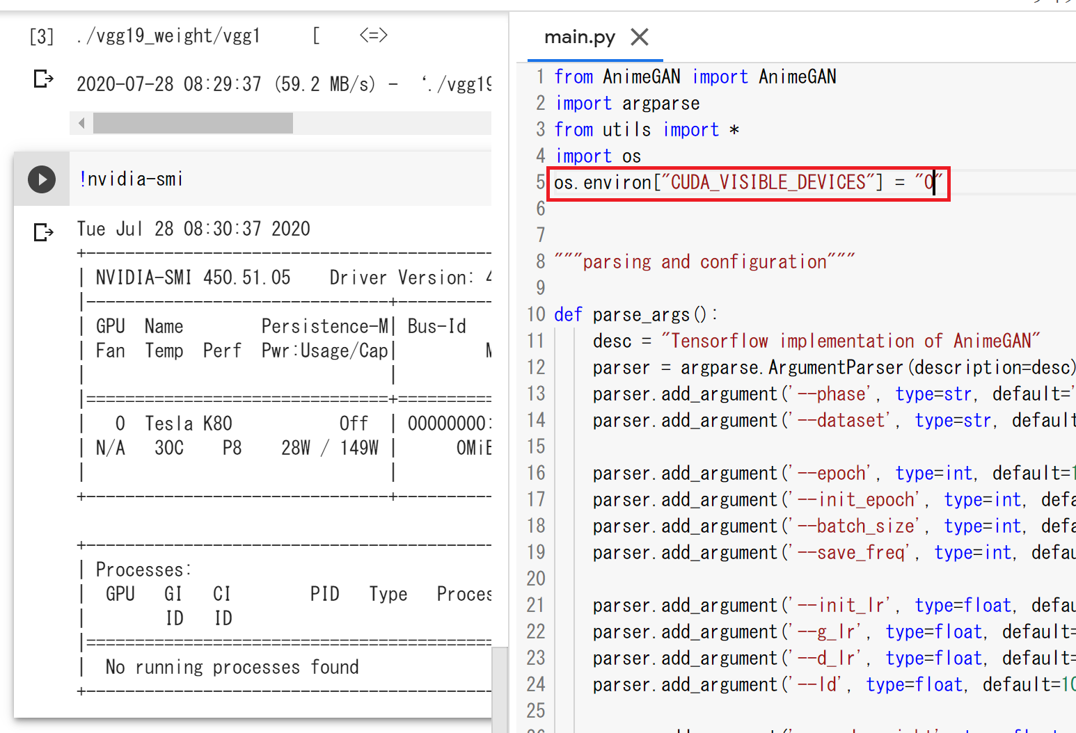 そのファイルを開いて以下を入力します。事前トレーニング済みモデル、vgg19の重み、トレーニングデータセットを対応するディレクトリにダウンロードして保存しています。