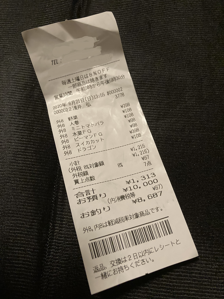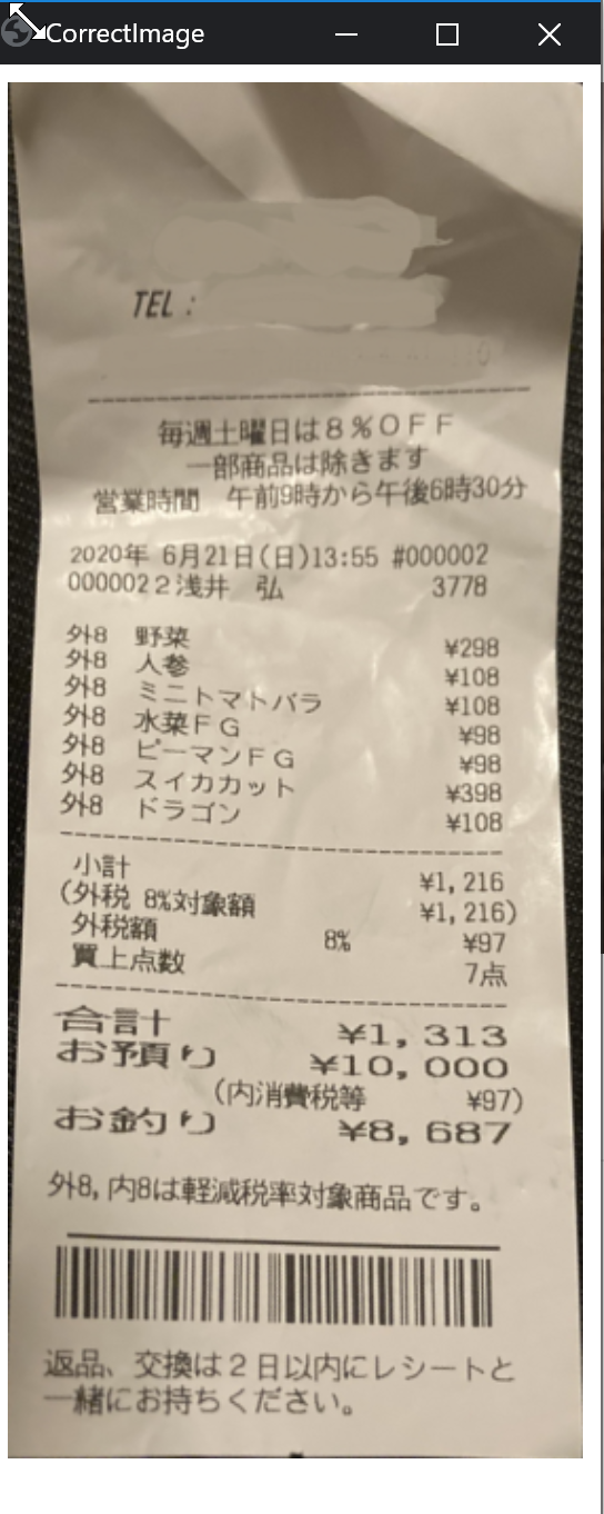 どんなAPIでも良いのですが、ちょうど仕事で斜めのドキュメントが移った写真がアップされて、めっちゃ見にくかったので、補正するAPIにしました。APIも完成していないのですがそれは置いておいて、やりたい事が伝わるように。 こんな斜めのレシートを↓