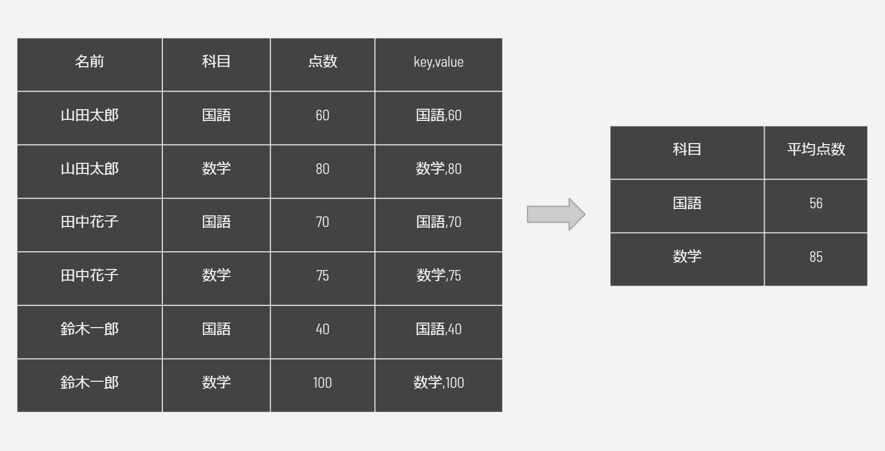 具体的な例を入れて説明します。 Mapタスクがそれぞれの国語と数学の点数をkey,valueとしてReduceタスクに渡します。Reduceタスクはそれぞれの平均を計算します。