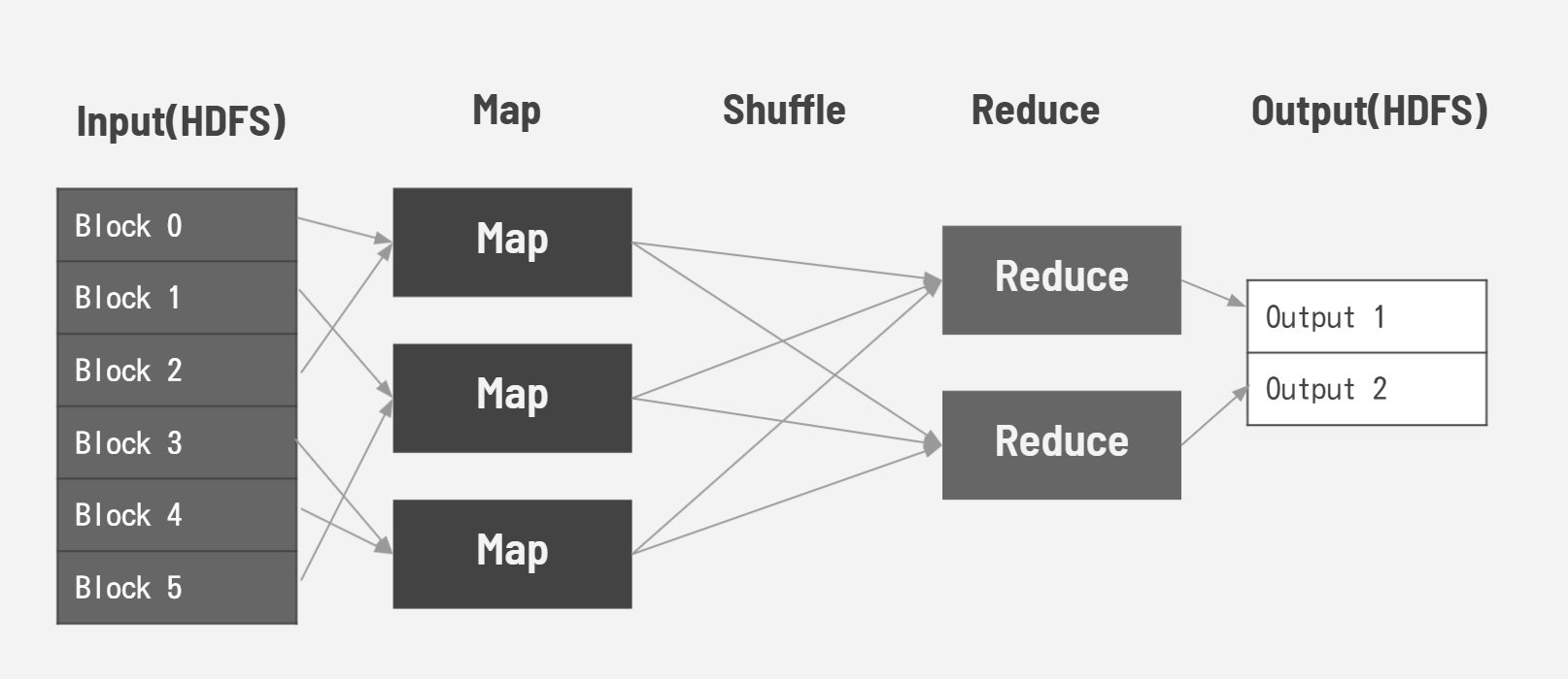 それを分散して以下のように実行するイメージです。MapタスクとReduceタスクの間にShuffleタスクがあります。Shuffleタスクではkeyをまとめますが、ユーザが意識するものではありません。