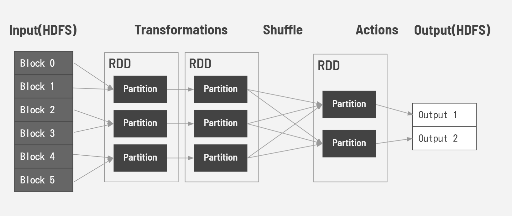 Sparkは、MapReduceを高速化するために開発されました。MapReduceはHDFSの読み書きに90%以上の時間を費やしています。Sparkはリアルタイムのデータ処理をメモリ内計算することで、処理時間を大幅に減らす事が出来ます。RDD(Resilient Distributed Datasets)という分散共有メモリの仕組みです。SparkRDDには「Transformations」と「Actions」の2つの操作があります。1つのRDDは複数のパーティションに分割され、パーティションごとに並列に変換処理(Transformations)を行います。また処理の途中でパーティション間のデータ交換(シャッフル)を行います。Actionsは値を返す操作です。