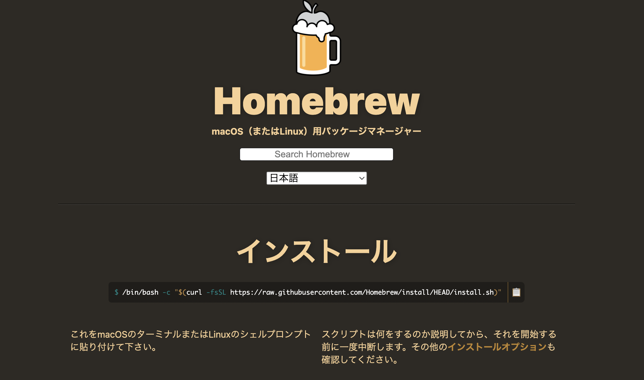 Homebrewをインストールします。以下サイトにあるインストールコマンドをコピーしてターミナルに入力します。 https://brew.sh/index_ja