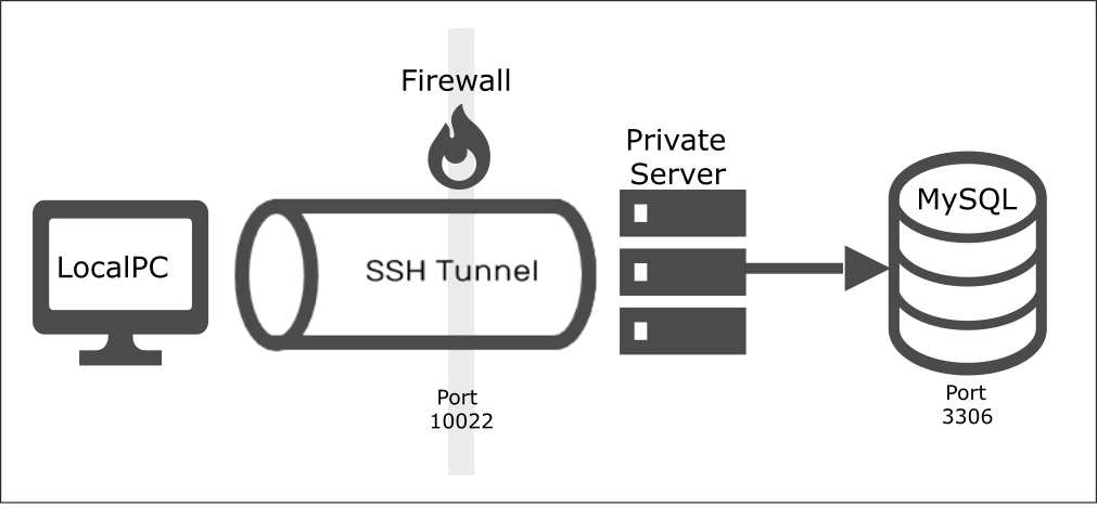 安全な代替手段は、ローカルPCからサーバーへSSHトンネルを作成してアクセスする事です。SSHトンネリングは、サービスポートを中継できるクライアントとサーバーマシンの間に暗号化されたSSH接続を作成する方法です。ローカルPCからサーバーにSSH接続し、そこからデータベースにアクセスする必要があります。