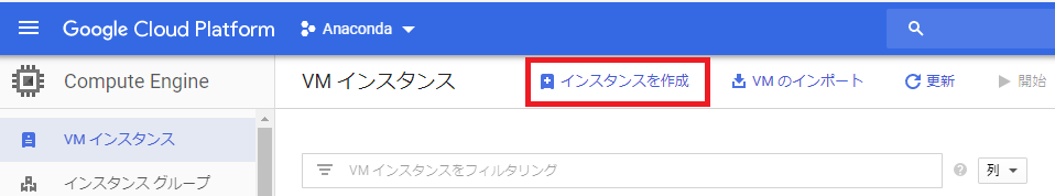GoogleCloudPlatformのコンソールにて、作成したプロジェクト内で「Computer Engine」を選択します。すると以下のような画面が出てきますので、VMインスタンスの「インスタンス作成」を選択します。