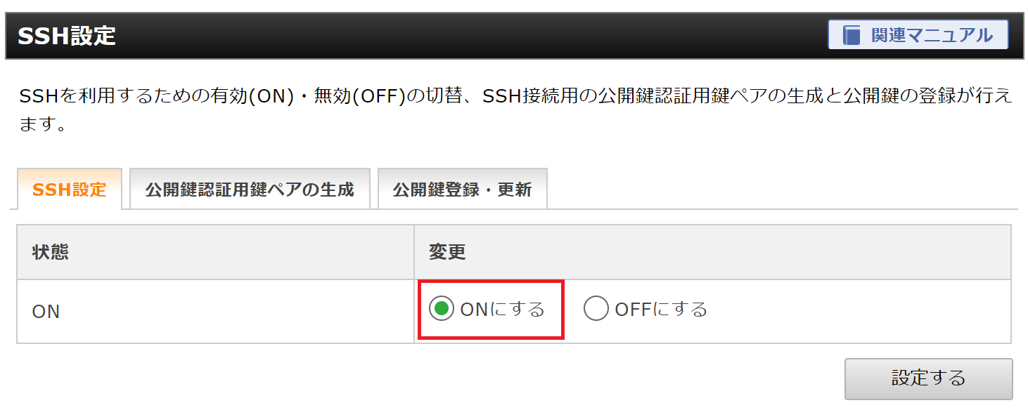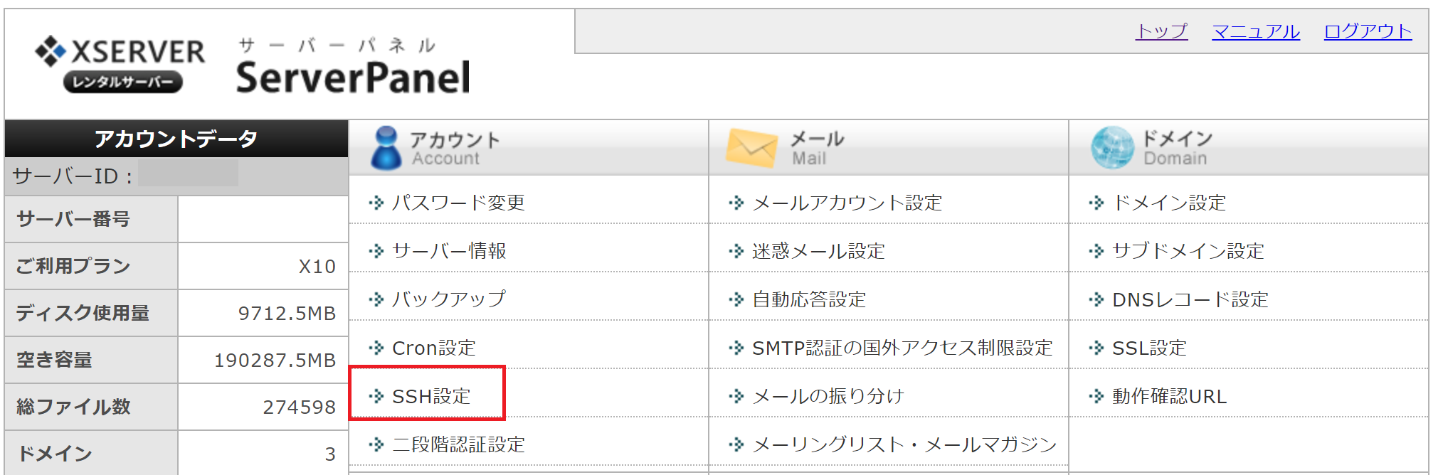 XServerのサーバーパネルにログインして、「SSH設定」をクリックします。