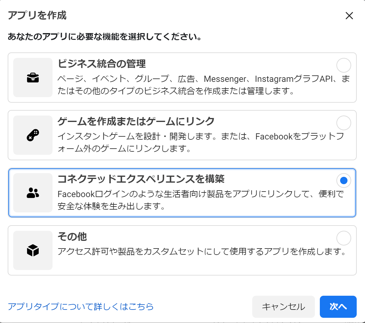 ログイン用にアプリを作成していきます。以下から合うものを選択します。私は「コネクテッドエクスペリエンスを構築」を選択します。