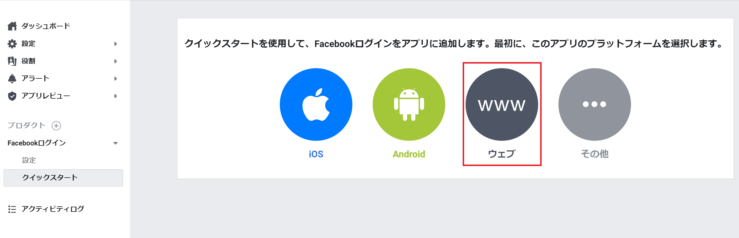次にFacebookログインのクイックスタートを選択して、www(ウェブ)を選択します。