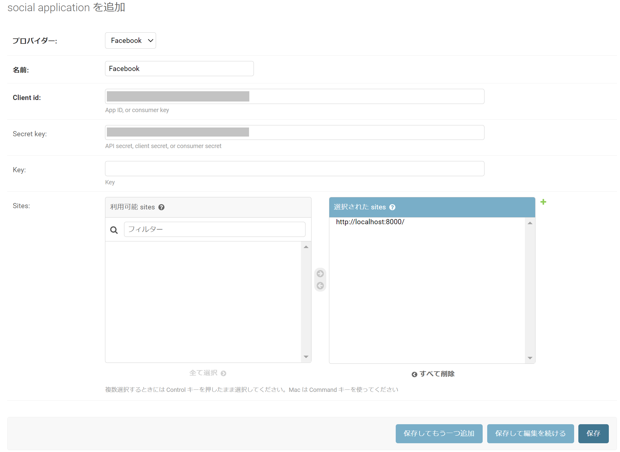 cliantIDとSecretKeyにfacebookのアプリIDとapp secretをそれぞれ入力します。Sitesにhttp://localhost:8000を登録します。
