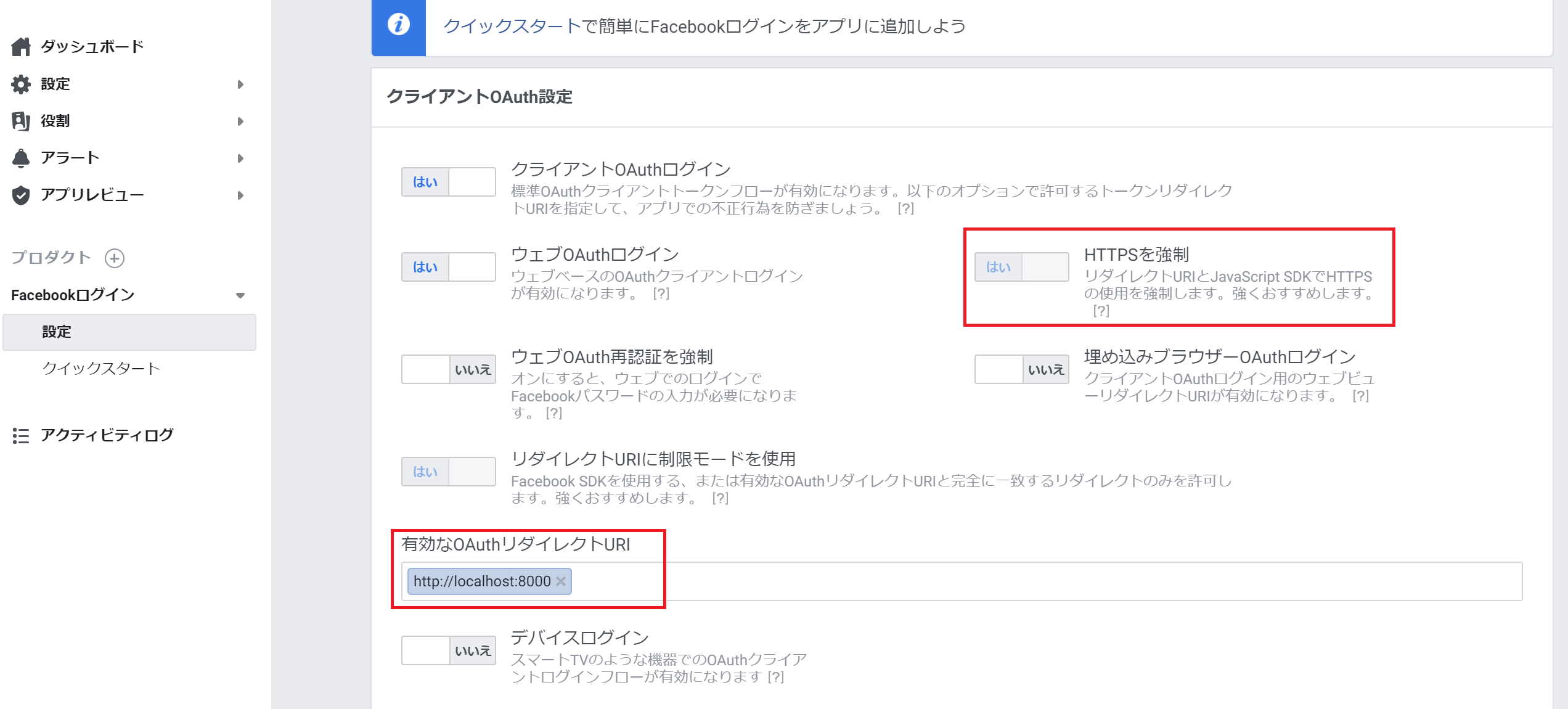 Facebookログインがhttps必須になったらしく、localhostではログイン出来ません。 以下で有効なOAuthリダイレクトURIにhttp://localhost:8000/を登録します。
