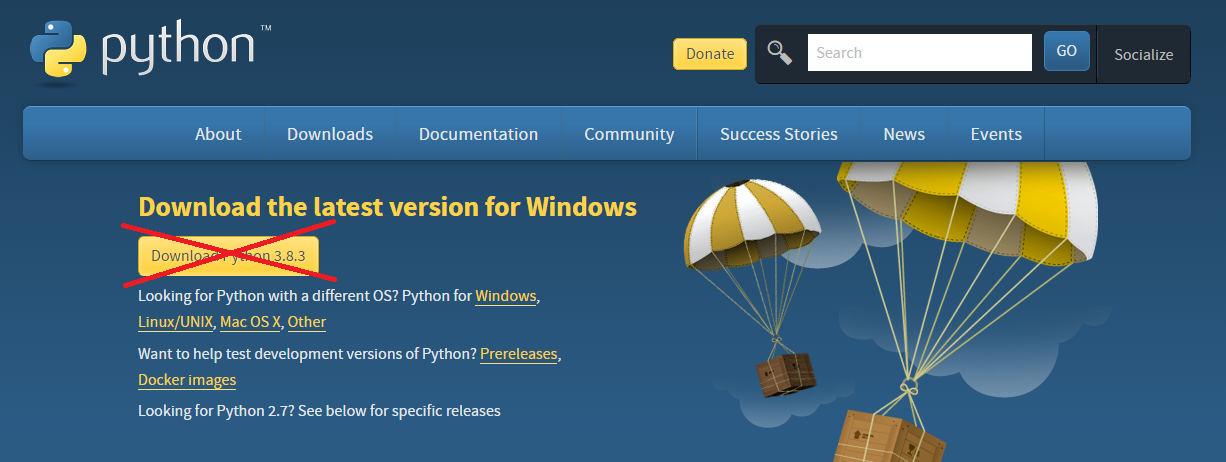 Pythonをダウンロードするのは以下サイトです。 https://www.python.org/downloads/ ×のところをクリックしてしまうと32bit版がダウンロードされてしまうので、