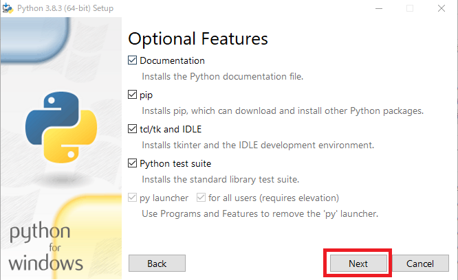好みによりますが、以下のようにインストールしました。 「Add Python 3.8 to PATH」のチェックをONにして、「Customize installation」を選択します。