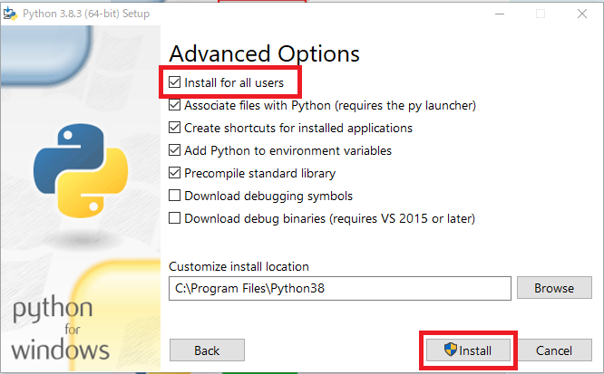 「Install for all users」のチェックをONにして、「Install」を選択します。