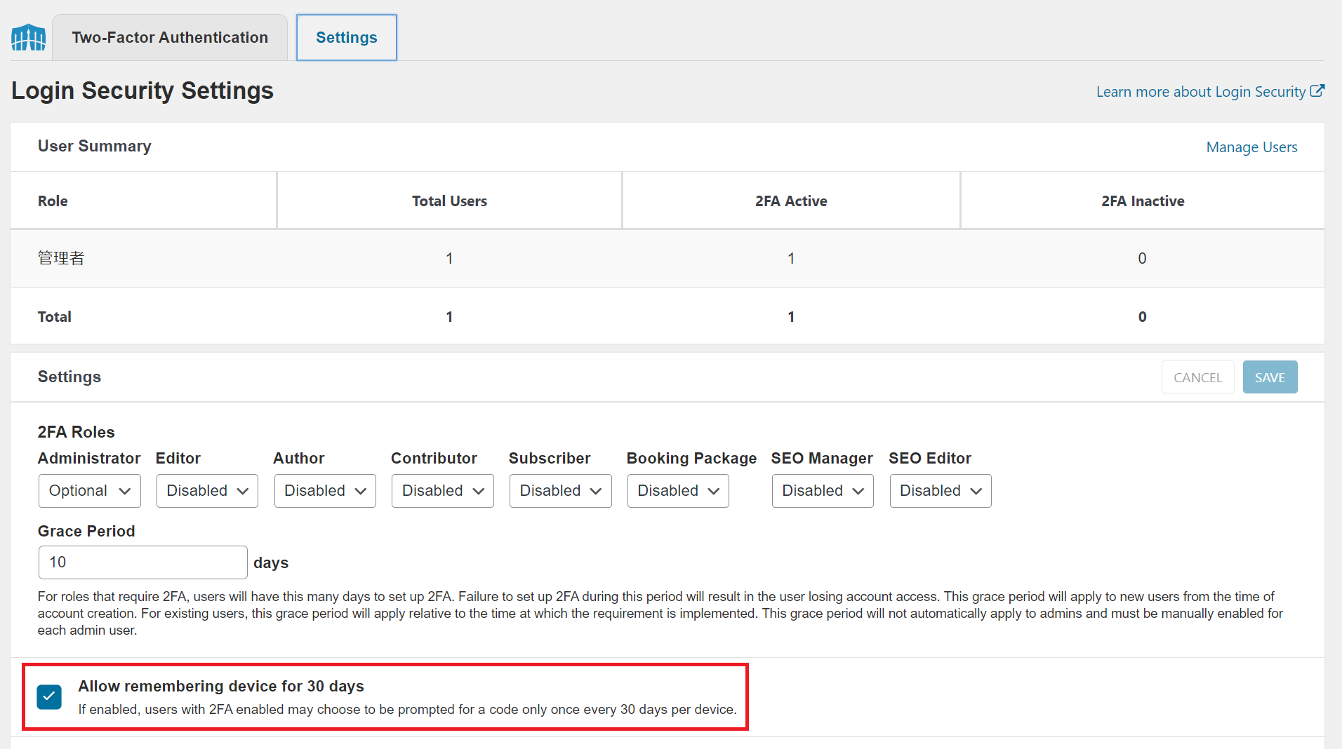 が、頻繁に2段階認証をするのは大変なので、30日間デバイス記憶してくれる機能を有効にしておきます。
